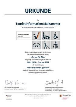 Der Deutsche Tourismusverband e.V. (DTV) hat die Touristinformation Maikammer offiziell mit der i-Marke ausgezeichnet. Diese Auszeichnung erhalten nur Touristinformationen mit sehr guter Beratungsqualität, umfangreichen Informationen und zusätzlichen Dienstleistungen für Gäste. Der DTV überprüfte zunächst 14 Mindestkriterien wie Infrastruktur, qualifiziertes Personal und kostenlose Grundinformationen. Anschließend folgte ein umfassender Qualitätscheck anhand von 40 Kriterien zu Außenanlage, Ausstattung, Informationsangebot und Servicequalität. Die Touristinformation Maikammer hat die Prüfung erfolgreich bestanden und darf nun drei Jahre lang mit der i-Marke werben, bevor eine erneute Überprüfung ansteht.