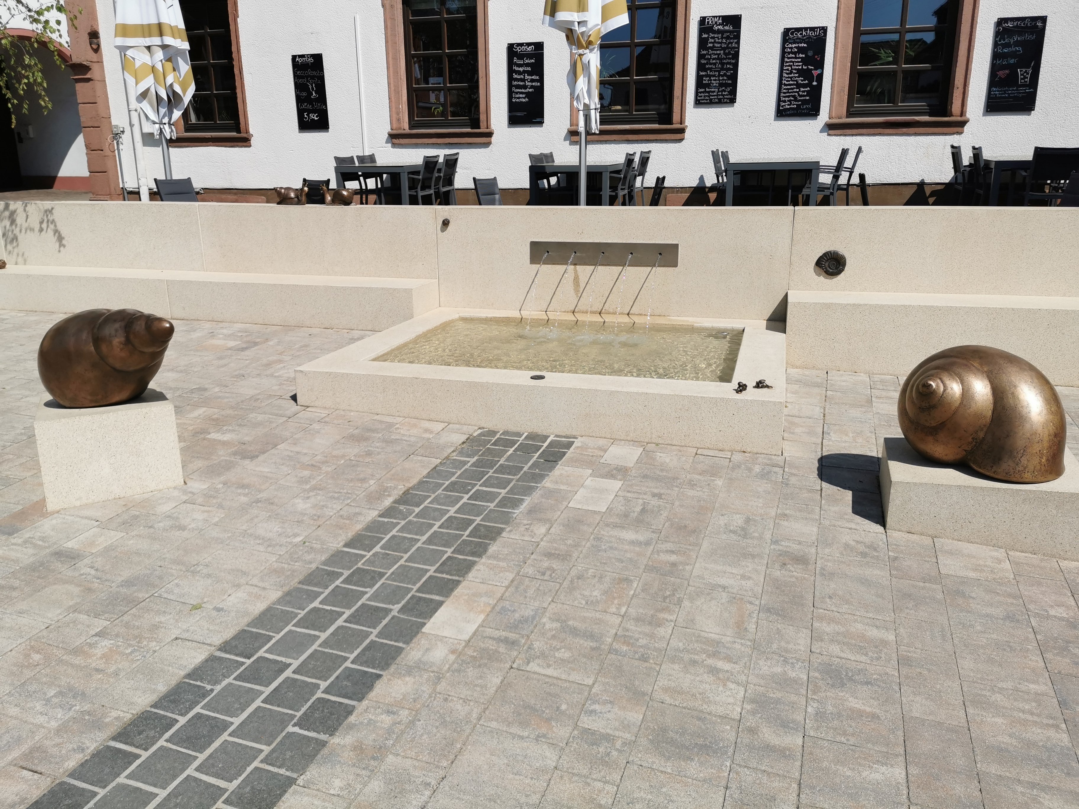 Gradlinig, modern und ohne Schnickschnack, so präsentiert sich der im Mai 2022 eingeweihte Cittaslow-Brunnen auf dem Marktplatz von Maikammer. Das Künstlerehepaar Gernot und Barbara Rumpf haben das Wahrzeichen der Cittaslow Vereinigung, der Schnecke, bei der Gestaltung des Brunnens zum Vorbild genommen und mit viel Geschick und einer Prise Humor den Brunnen gefertigt.