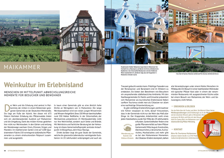 Seit 2009 ist Deidesheim Mitglied der Vereinigung „cittaslow“ und seit 2017 die Ortsgemeinde Maikammer, damit gehören in Rheinland-Pfalz zwei Gemeinden zu dieser exklusiven Gemeinschaft.