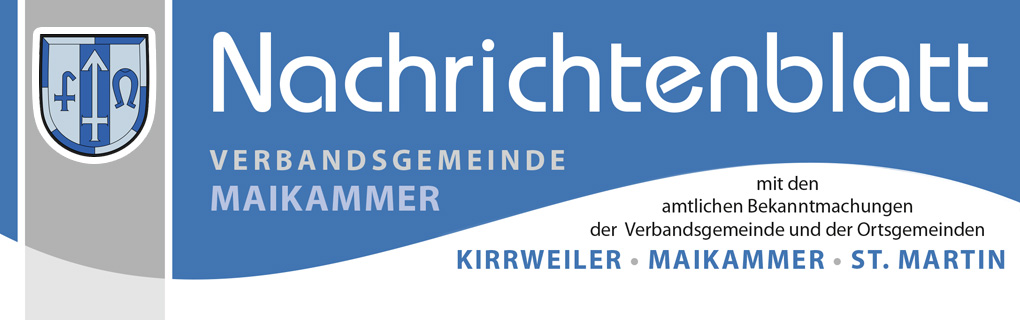 Das Nachrichtenblatt mit den amtlichen Bekanntmachungen der Verbandsgemeinde Maikammer und den Ortsgemeinden Kirrweiler, Maikammer und St. Martin finden Sie aktuell auf der Website unserer Verbandsgemeinde. Jede Woche können Sie dort das neue Nachrichtenblatt als PDF Datei herunter laden. Sie finden auch ältere Ausgaben aus den vergangenen Jahren.